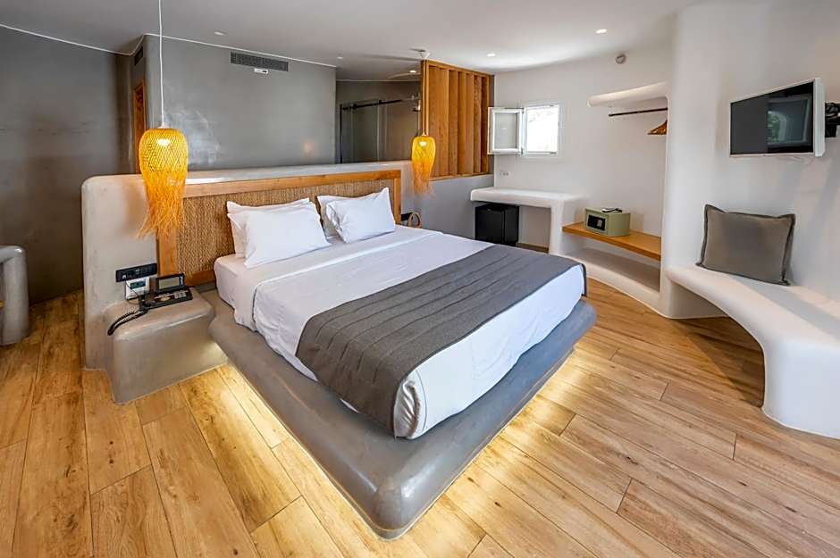 A variety of room types are available, including Deluxe, Superior Suite, Honeymoon Windmill Suite, Windmill Suite, White Suite, and more. Options include Sea View and Garden View, with several rooms offering pool access for added convenience. Many accommodations are designed for two adults, providing a comfortable base for a stylish Greek escape.